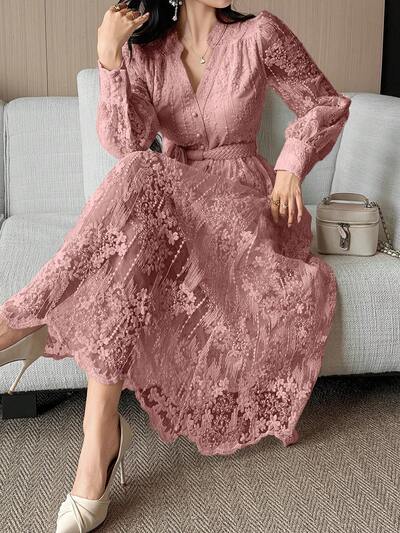 Damen elegantes Spitzenkragen Gürtelkleid in Knielänge, Frühlings-/Sommer-Sommerkleid-40%