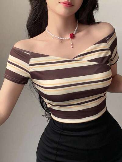 Lässiges gestreiftes T-Shirt, Off-Shoulder, Kurzarm, Sommer