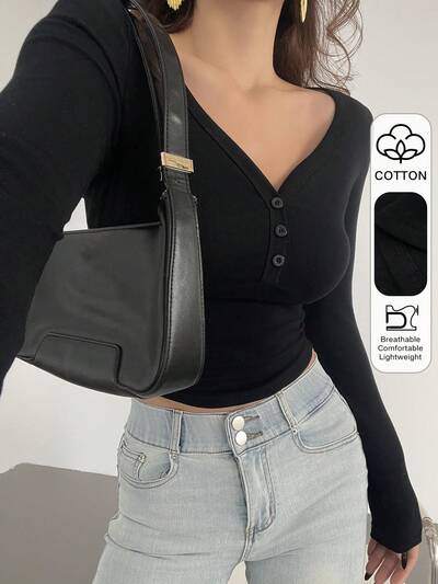 V-Ausschnitt Teilweise Knopfverschluss Gekrümmter Saum Figurbetontes Langarm Damen T-Shirt-43%
