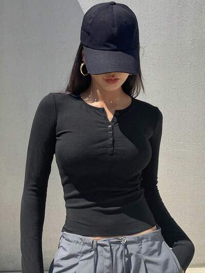 Damen Lässig einfarbiges Crop T-Shirt mit Knopfleiste und Langarm-49%