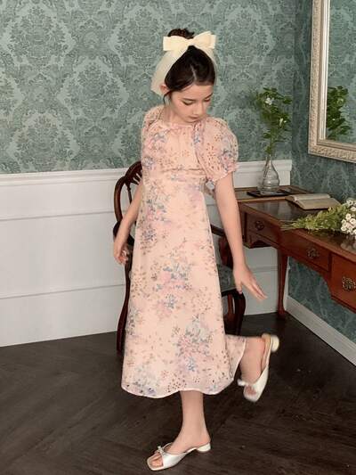 Vestido de verano de manga corta con bordado francés y estampado floral pequeño para vacaciones, para niñas