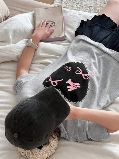 Camiseta de manga corta con cuello redondo, mangas raglán y estampado de color contrastante para niñas preadolescentes, verano