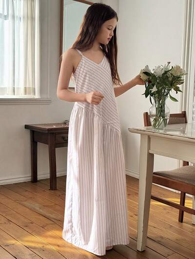 Vestido casual de verano para niñas preadolescentes con rayas, encaje de contraste y hombros caídos