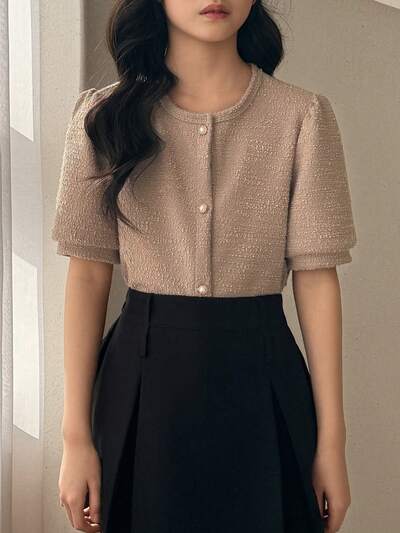 Blusa elegante de manga corta con botones delanteros de unicolor para niña preadolescente, primavera/verano