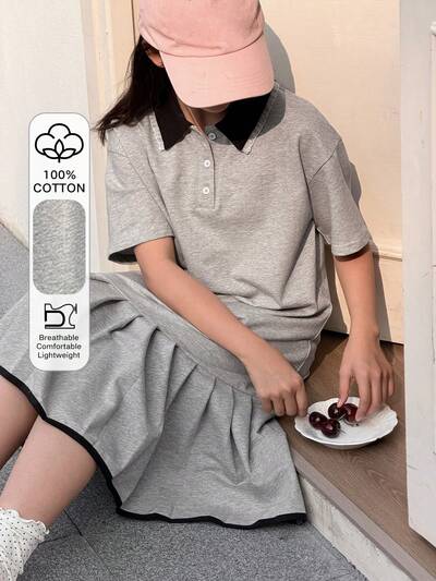 Camisa polo de manga corta con bordado de lazo y ribete de contraste, estilo casual de uso diario y escolar para niñas preadolescentes, verano-44%