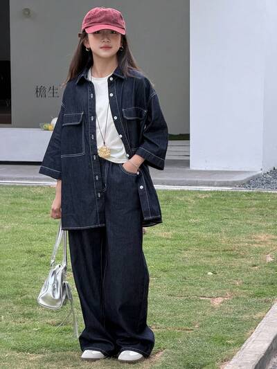 Conjunto informal de niña preadolescente de camisa vaquera de hombros caídos y pantalón vaquero de cintura con cordón y pierna ancha, para uso diario y casual en primavera/verano/otoño