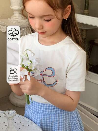 Set de 2 piezas de ropa para niña preadolescente para otoño: Camiseta de manga corta con cuello redondo y estampado total de punto para niñas preadolescentes + Pantalón largo de tela con estampado de lazo, ropa para primavera/verano y vuelta al colegio