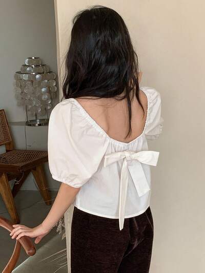 Blusa casual de manga corta con lazo y espalda descubierta de unicolor para niña preadolescente