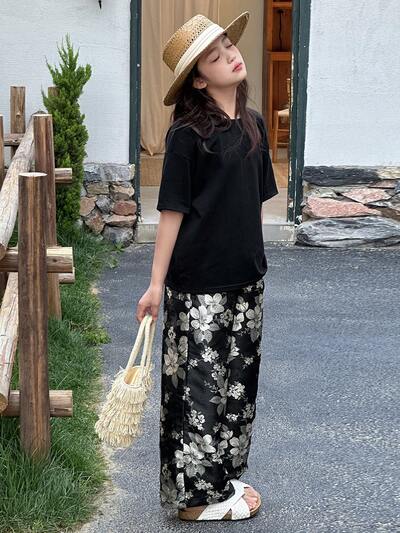 Conjunto de camiseta de manga corta de unicolor y pantalones con estampado floral para niñas preadolescentes en verano