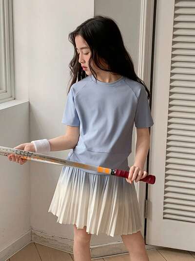 Conjunto deportivo informal de niña preadolescente con top de manga corta de color contrastante y minifalda