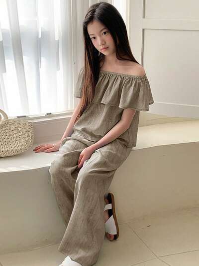 Set de 2 piezas para niñas preadolescentes - Blusa de hombros descubiertos de unicolor y pantalones largos