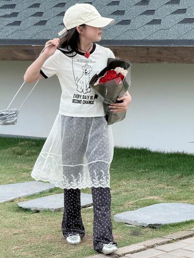 Set de 2 piezas para niñas preadolescentes, camiseta de manga corta con cuello redondo estampada + pantalón largo, ropa de primavera/verano, de vuelta al colegio