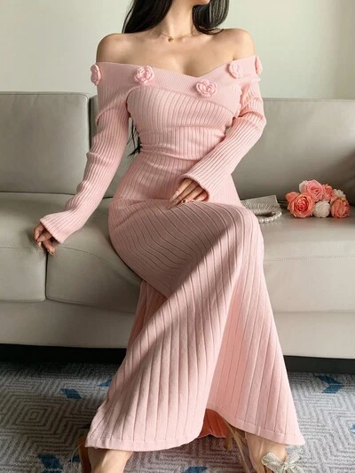 Vestido de cóctel ajustado que realza la cintura para otoño/invierno, vestido de fiesta sexy con hombros descubiertos y decoración floral, vestido de noche de moda para boda, banquete, baile-50%