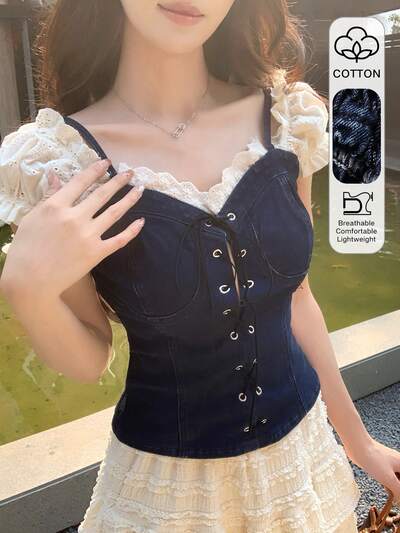 Parte superior corta con empalmado de color contrastante y ribete de encaje blanco, camiseta de tirantes vintage lavada, diseño de bustier ajustado casual para festival de música con camisa vaquera con cordones para mujeres, para verano y primavera