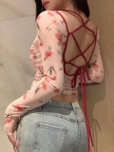 Blusa de manga larga con estampado floral rojo, espalda descubierta, cordón de ajuste y empalmado de color contrastante de malla para mujer, ropa de mujer de otoño para Pascua