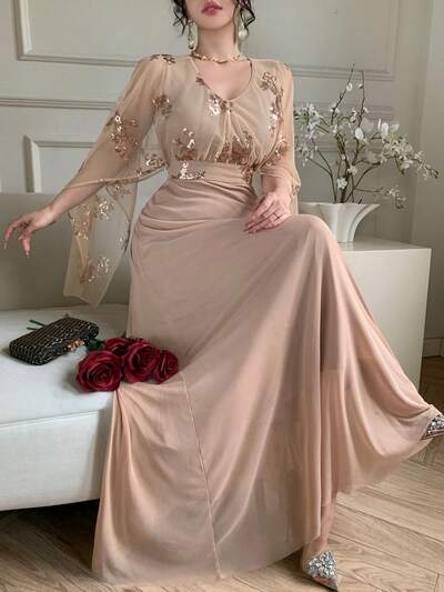 Vestido de mujer elegante de longitud media con cuello en V, mangas con volantes y lentejuelas con estampado floral, para invitada de boda, primavera/verano