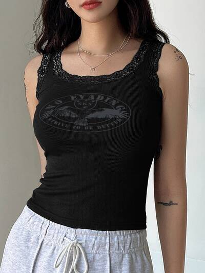 Blusa Sin Mangas Con Ribete De Encaje, Diseño De Águila Y Letra