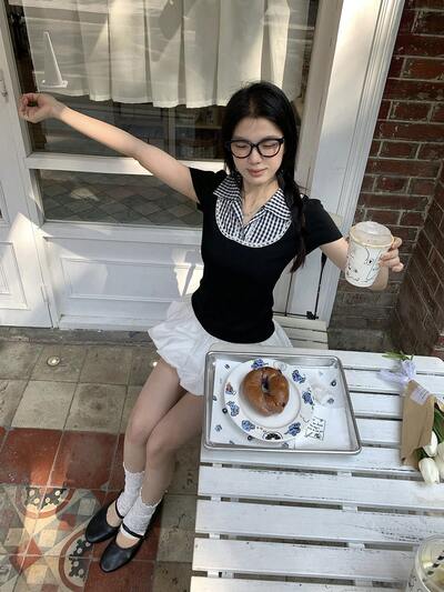 Camiseta de manga corta con cuello y parches a cuadros para mujer, primavera/verano