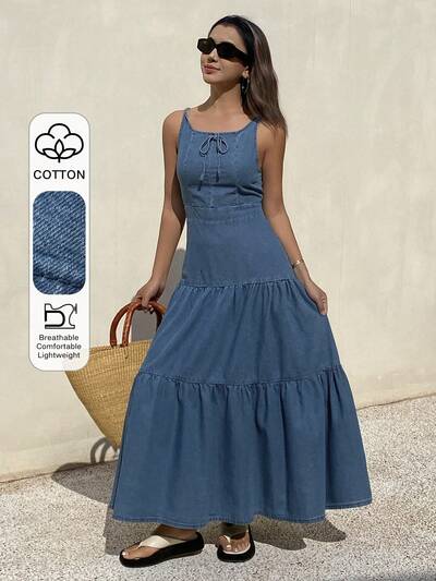 Vestido vaquero casual largo de mujer con decoración de lazo