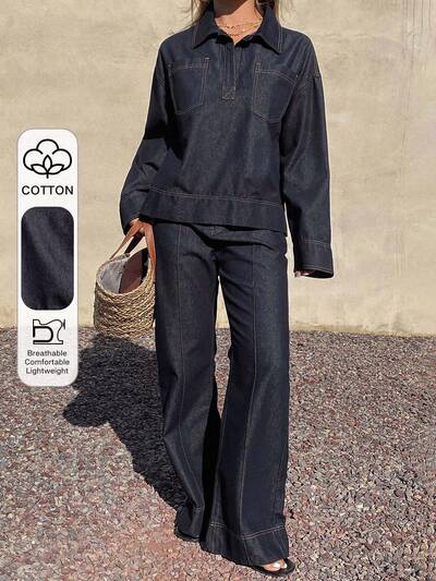 Conjunto informal de primavera para mujer de tela vaquera, camisa de corte holgado con cuello decorado con pespuntes y pantalones de corte relajado