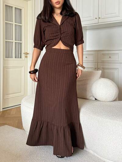 Conjunto de 2 piezas de blusa de manga abullonada a rayas y falda casual de verano para mujer