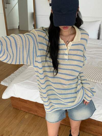 Jersey holgado de punto con cuello polo, mangas largas y rayas de contraste de color para mujer, otoño/invierno
