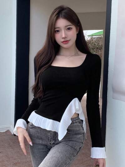 Blusa de manga larga con cuello cuadrado, volantes y paneles de contraste, ropa de otoño para mujer