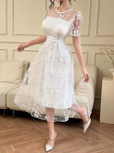 Vestido de encaje floral de manga corta con cuello redondo y largo medio para mujer, adecuado para vacaciones, cita nocturna, elegante vestido de verano