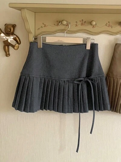 Minifalda plisada con cordones y bloques de color para mujer, unicolor liso, gris oscuro, para todas las estaciones y otoño