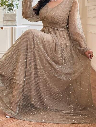 Dazy Plus Vestido elegante de manga farol con cintura ceñida y lentejuelas, para mujer de talla grande, vestido de graduación de primavera/verano, nuevo atuendo de año nuevo para mujer, vestido brillante de carnaval, vestido de verano