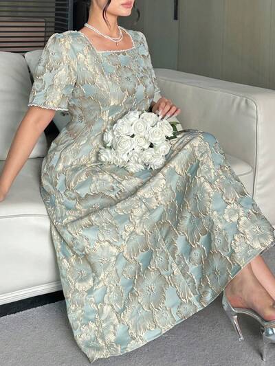 Dazy Plus Vestido maxi elegante de manga larga con cuello cuadrado, cintura ceñida y textura floral para mujeres de talla grande para fiestas y días soleados