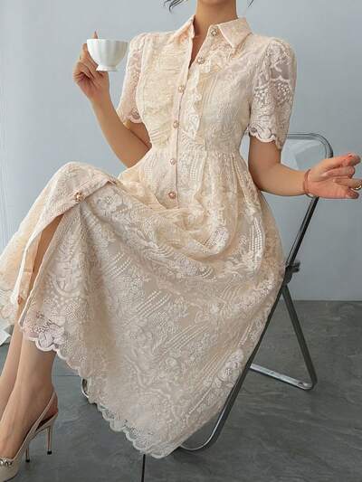 Vestido corto de mujer con encaje, parches y botones delanteros, de manga corta y elegante