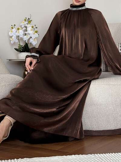 Vestido suelto y elegante de media longitud con mangas raglán, cuello de parche de lentejuelas y estampado para mujer
