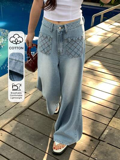 Dazy Plus Jeans de pierna recta holgados con cintura regular y cuentas de perlas, estilo casual de ciudad para mujeres de talla grande en primavera/verano