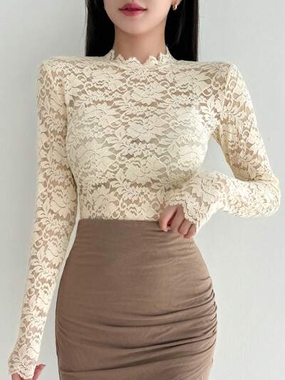 Blusa de manga larga y transparente con ribete de ganchillo de unicolor para mujer, blusas casuales para vacaciones y salir