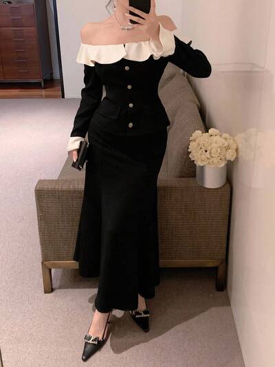 Conjunto de top hombros descubiertos con color contrastante y falda de cola de pez, conjunto elegante y casual urbano para dama-26%