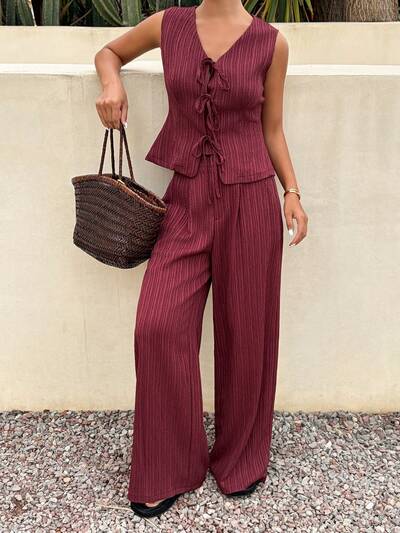 Set de 2 piezas de chaleco cruzado casual y pantalones de pierna ancha para mujer-70%