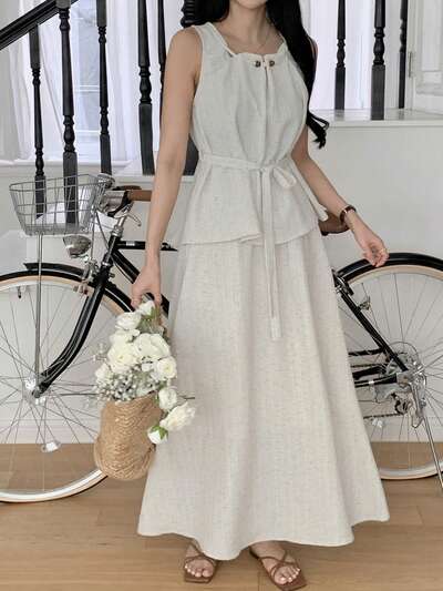 Conjunto de 2 piezas de top de tirantes y falda de unicolor casual para mujer, de verano