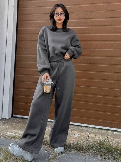 2 piezas Conjunto de mujer con sudadera con capucha de cuello redondo sólido y pantalones de pierna ancha, conjunto de ropa de otoño, conjunto de chándal para mujer, conjunto de estar en casa para mujer