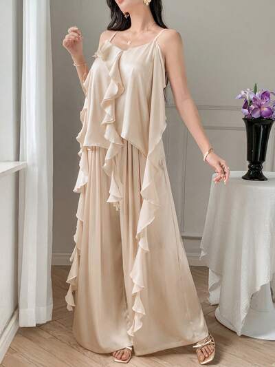 Set de 2 piezas para mujer con top de tirantes sin mangas con aplicaciones de encaje y pantalones de pierna ancha
