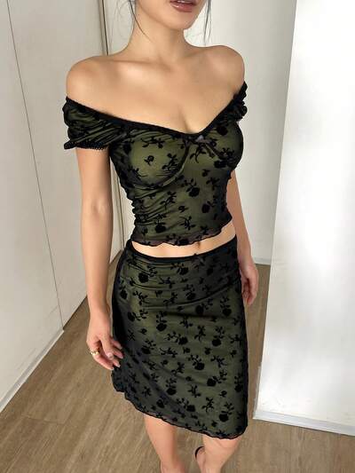 Set de 2 piezas - Conjunto de top corto y falda mini de encaje calado de colores contrastantes, verano negro para mujer