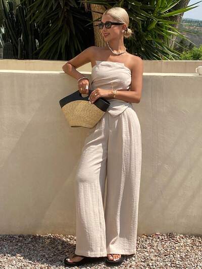 Set de 2 piezas con top y pantalones sólidos y texturizados para mujer, para primavera/verano