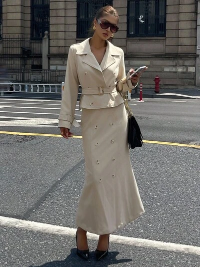 Conjunto elegante de 2 piezas con chaqueta de cuello con solapa de manga larga y doble botonadura, y falda midi con cola de pez para mujer, para otoño