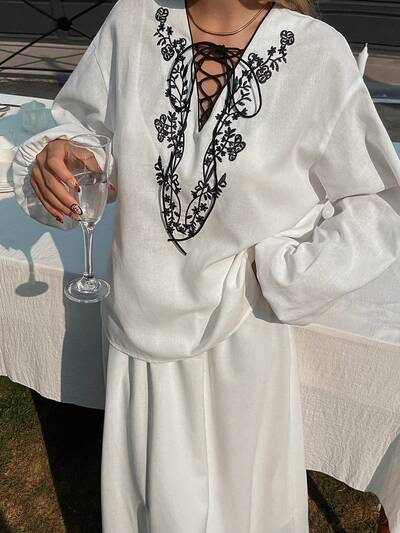 Conjunto informal de 2 piezas de blusa de manga farol con escote en V y bordado de plantas y falda, estilo vacacional para primavera/otoño