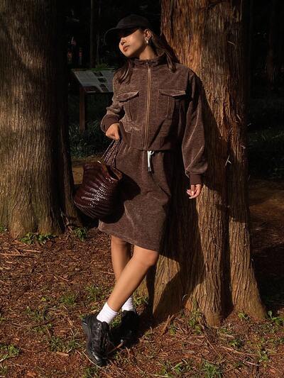 Conjunto de 2 piezas de chaqueta de pana de manga larga casual con bolsillos y falda recta para mujer, otoño