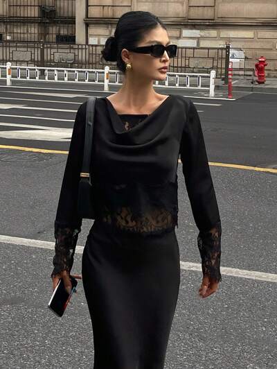 Conjunto de 2 piezas con blusa de cuello drapeado con parches de encaje y falda con bajo de sirena para mujer, para el verano