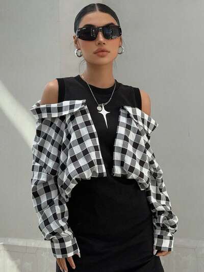 Vestido de mujer con parches a cuadros, hombros descubiertos, mangas tipo murciélago, vestido mini, vestido de otoño de manga larga