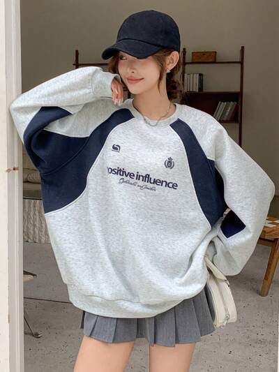 Sudadera holgada de mujer con cuello en V, parches de color contrastante, estampado de letras, ropa casual de calle, otoño/invierno