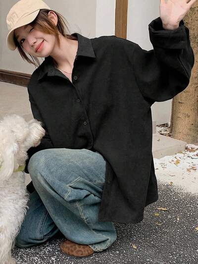 Blusa casual, elegante y vintage de manga larga, ajuste ceñido en la cintura, unicolor, estilo preppy para mujer