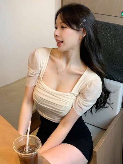 Camiseta de manga corta con cuello cuadrado y pliegues, top corto para mujeres de verano